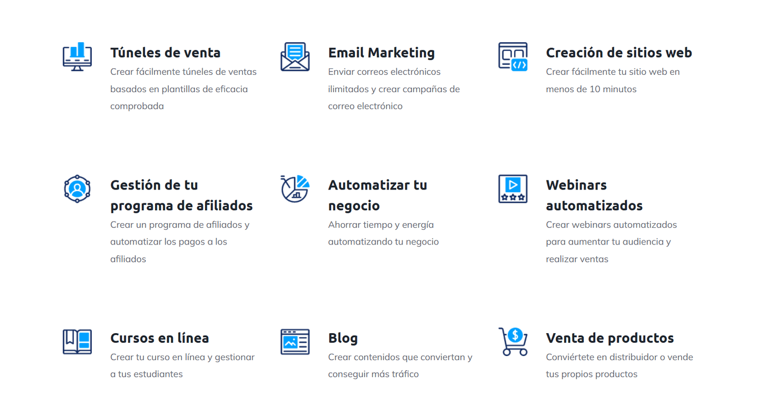 Ya sea que quieras vender cursos, automatizar emails o crear un embudo de ventas completo, podrás hacerlo desde un solo lugar y sin gastar nada.